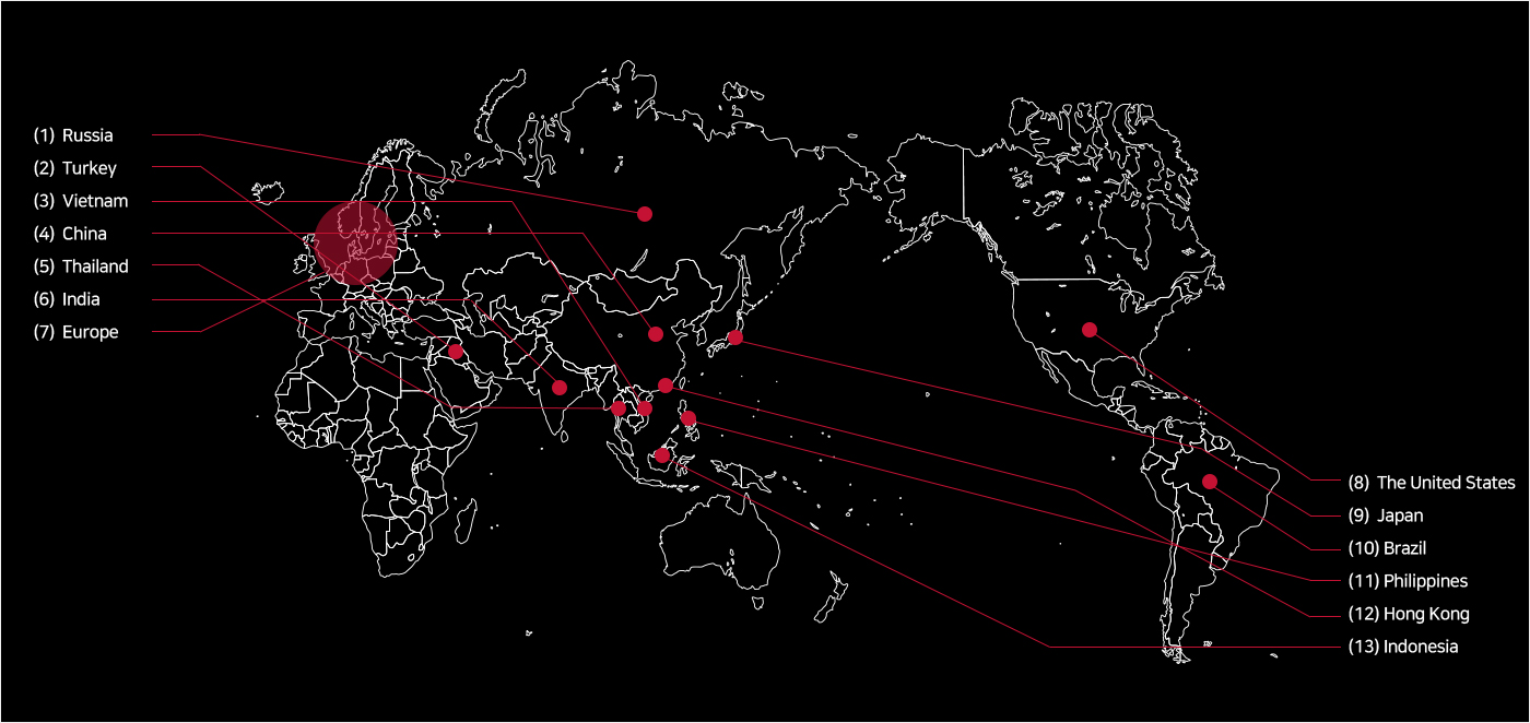 Rusya, Türkiye, Vietnam, Çin, Tayland, Hindistan, Avrupa Ülkeleri, ABD, Japonya, Brezilya, Filipinler, Hong Kong, Endonezy